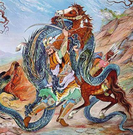 Rostemé Zal yenilmez bir savaşçıdır. şeytanı bile teke tek döğüşte yenmiş ve böylece yenilmez olduğunu ispatlamıştır. şeytan "seni, yine sen öldüreceksin" demiş ve bunu yapmak için epeyce uğraşmıştır. en sonunda şeytan, sudan tahmina adlı bir güzeller güzeli kadın yapmış ve Rostem’in tahmina ya aşık olmasını ve onu elde edememesini sağlamıştır. Neyse, kralı ile arası bozulan rostem, doğu sınırını tek başına korumak için sınıra yollanmış ve şeytan ile ahbaplık kurup arkadaş olmaya başlamıştır. Sınırında Rostem’in olduğunu öğrenen komşu kral: Büyük bir ordu ile onun üstüne gidecekken rüstem in yaptıklarından etkilenen komşu prenses bunu önlemiş ve rüstem i saraya çağırmıştır. Aslında bu prenses Rostem in her zaman hayalini kurduğu Tahmina dır ve su değildir. Evlenirler. Bir çocukları olur. Rostem savaşmaya tekrar başlar ve yirmi küsür yıl sonra bilmeden kendi oğlu ile çarpışır. Kaybeder. Rostem'i yenen de kendi oğludur.
